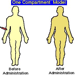 Slide 5 Slide of body before and after a rapid I.V. bolus injection, considering the body to behave as a single compartment. In order to simplify the mathematics it is often possible to assume that a drug given by rapid intravenous injection, a bolus, is rapidly mixed. This slide represents the uniformly mixed drug very shortly after administration.