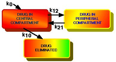 Slide 8 A diagram of a two compartment model showing the parameters to be measured. The processes of distribution and excretion can be represented by the rate constants k12, k21, and k10. The rate constant k0 representing an infusion or absorption process. The drug appears to be dissolved in the body volume. This volume is the 'apparent' volume of distribution.