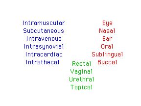 Slide 12 Slide showing a model with the various routes of administration. Later we will discuss different routes of administration and see how these effect the kinetics of drug disposition. For example absorption through the lining of the mouth, buccal absorption, often results in rapid absorption without the drug passing through the liver where it can be broken down. However, only low dose drugs can be accommodated by this ROA. Orally absorbed drugs are absorbed in the stomach or intestines and enter the portal blood supply and go to the liver before getting into the central blood supply. This can result in extensive metabolism of the drug before it can take any action. For this reason some drugs are very inefficient when given orally.