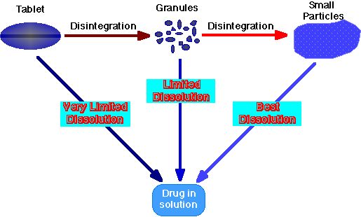 Slide 13 Slide showing the processes involved in the dissolution of a tablet before absorption. A drug cannot be absorbed across the intestinal wall as a solid. It must first dissolve in the fluid of the G-I tract. Tablets are carefully formulated, designed, to stay together in the bottle during transport but break up quickly once they are in an aqueous environment. This can be an easy or difficult job depending on the drug and the dose required. There are therefore dissolution tests specified to ensure that tablet formulations work. Also it may be appropriate to conduct experiments with human volunteers to ensure that the tablet does release the drug as it should.