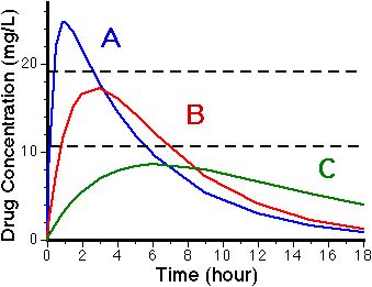 Slide 17 Slide showing plasma concentration time curves for three theoretical formulations with different ka values. The plasma concentrations achieved can be controlled by the rate of drug absorption. As shown product I would be toxic. A smaller dose, or a slower formulation should be considered. Formulation II appears to be effective in the dose and formulation used. The dosage form III appears to be too slow and thereby ineffective. If it is a drug requiring a sustained effect this formulation may be more useful at a higher dose or after repeated doses.