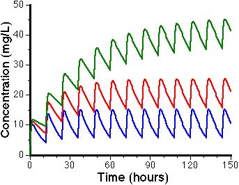 Slide 21 Slide showing multiple dose curves with slow, medium, and fast excretion. Alteration of drug elimination is particularly important when drugs are given repeatedly. If it is assumed that the drug is eliminated normally when in fact it is slowly eliminated, drug accumulation may occur with toxic concentrations reached. Alternately faster elimination than expected may cause sub therapeutic concentrations to be reached.