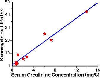 Slide 23 Slide showing relationship between kanamycin half-life and serum creatinine level. As kidney function is reduced the serum creatinine level increases and the also the kanamycin takes longer to be eliminated from the body.