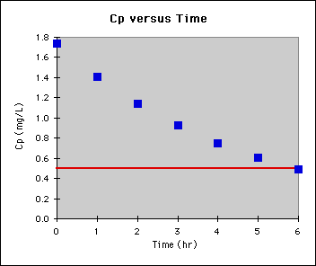 If 0.5 = Cp0 x e-0.21 x 6 then Cp0 = 1.8 mg/L.