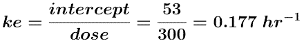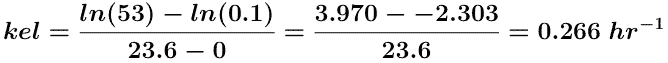 Estimating the intercept value to be 53 mg/hr and if the line crosses the axis at 23.6 hr where the rate of excretion is 0.1 mg/hr a value for kel can be estimated.