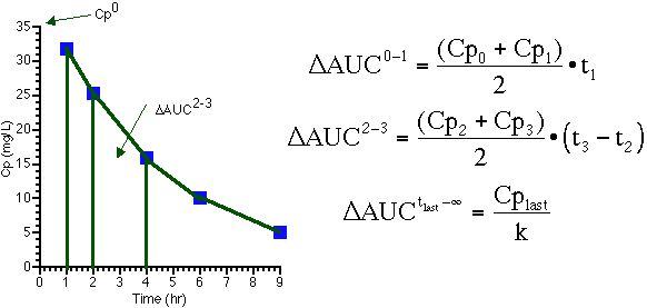 - First Segment - Extrapolate concentration back to y-axis to estimate Cp0. This is best done on semi-log graph paper. Calculate the first AUC segment using the trapezoidal rule.