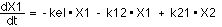 The kel * X1 term describes elimination of the drug from the central compartment, while the k12 * X1 and k21 * X2 terms describe the distribution of drug between the central and peripheral compartments.